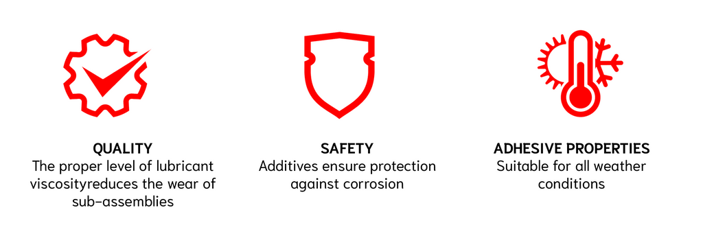 • The excellent properties of the Nevada chain lubricating oil ensure that the lubricant effectively adheres to the moving parts of the equipment. Highly refined mineral oil and an enriching additive compound guarantees perfect lubrication at all temperature. It improves protection against corrosion and abrasive wear.